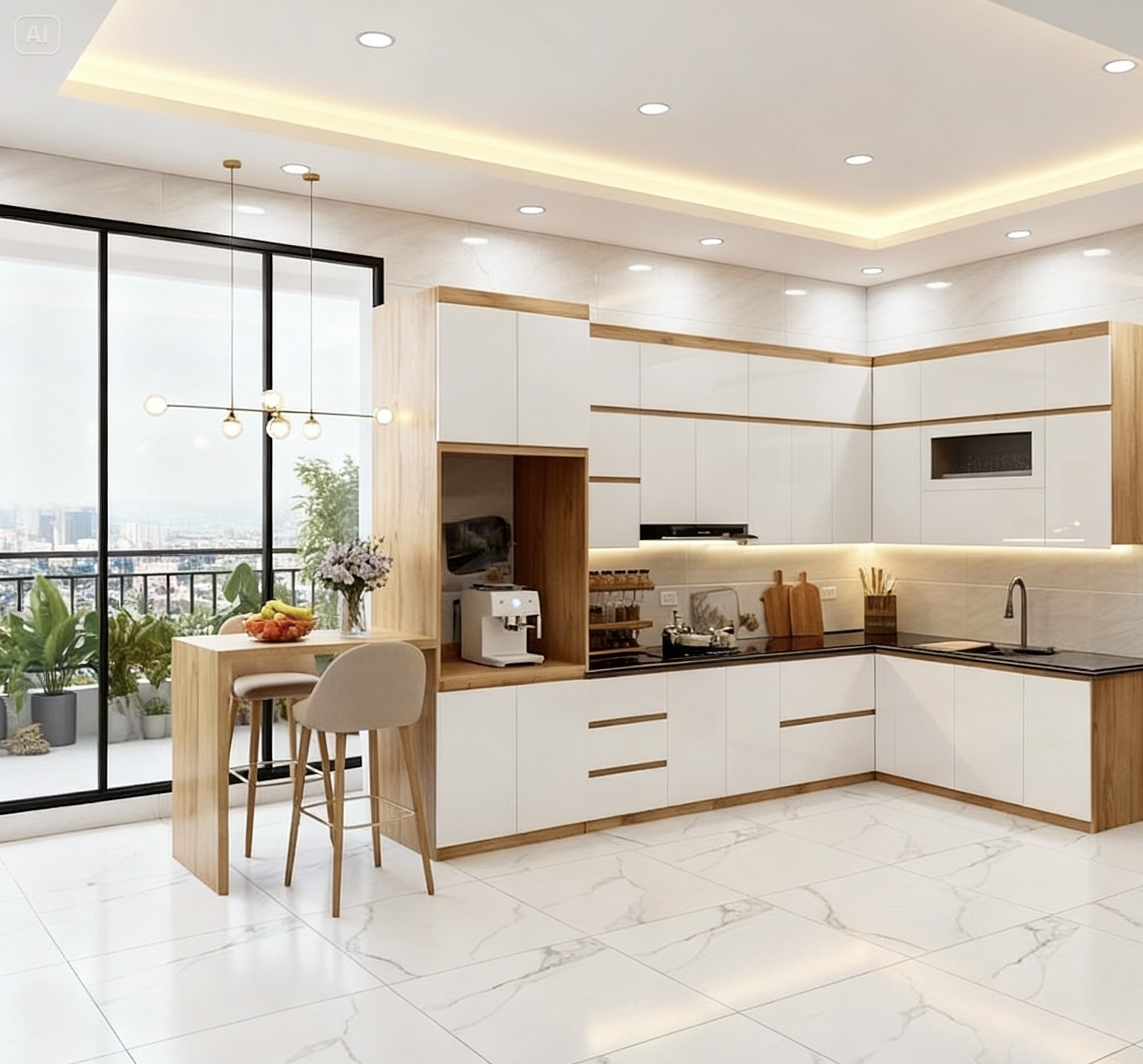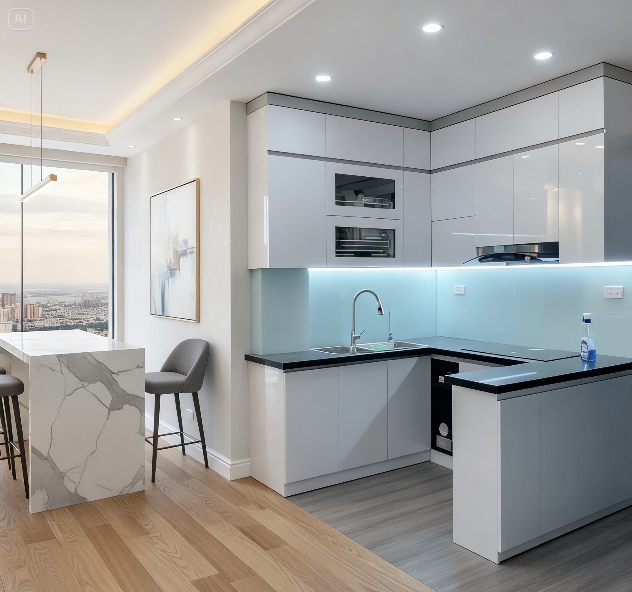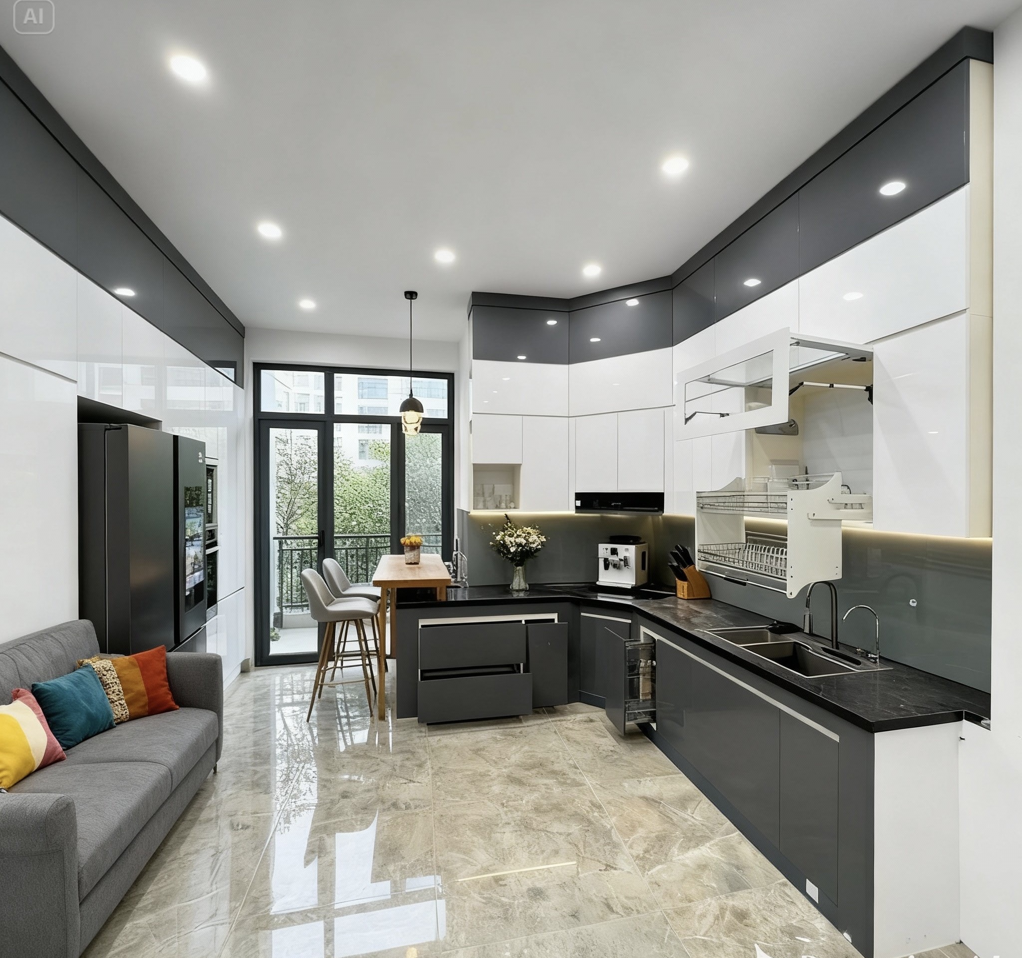 - Tủ bếp thông minh: Các tủ bếp có tính năng tự động mở đóng, đèn LED chiếu sáng, ngăn kéo nâng hạ tự động giúp tăng cường sự tiện nghi.