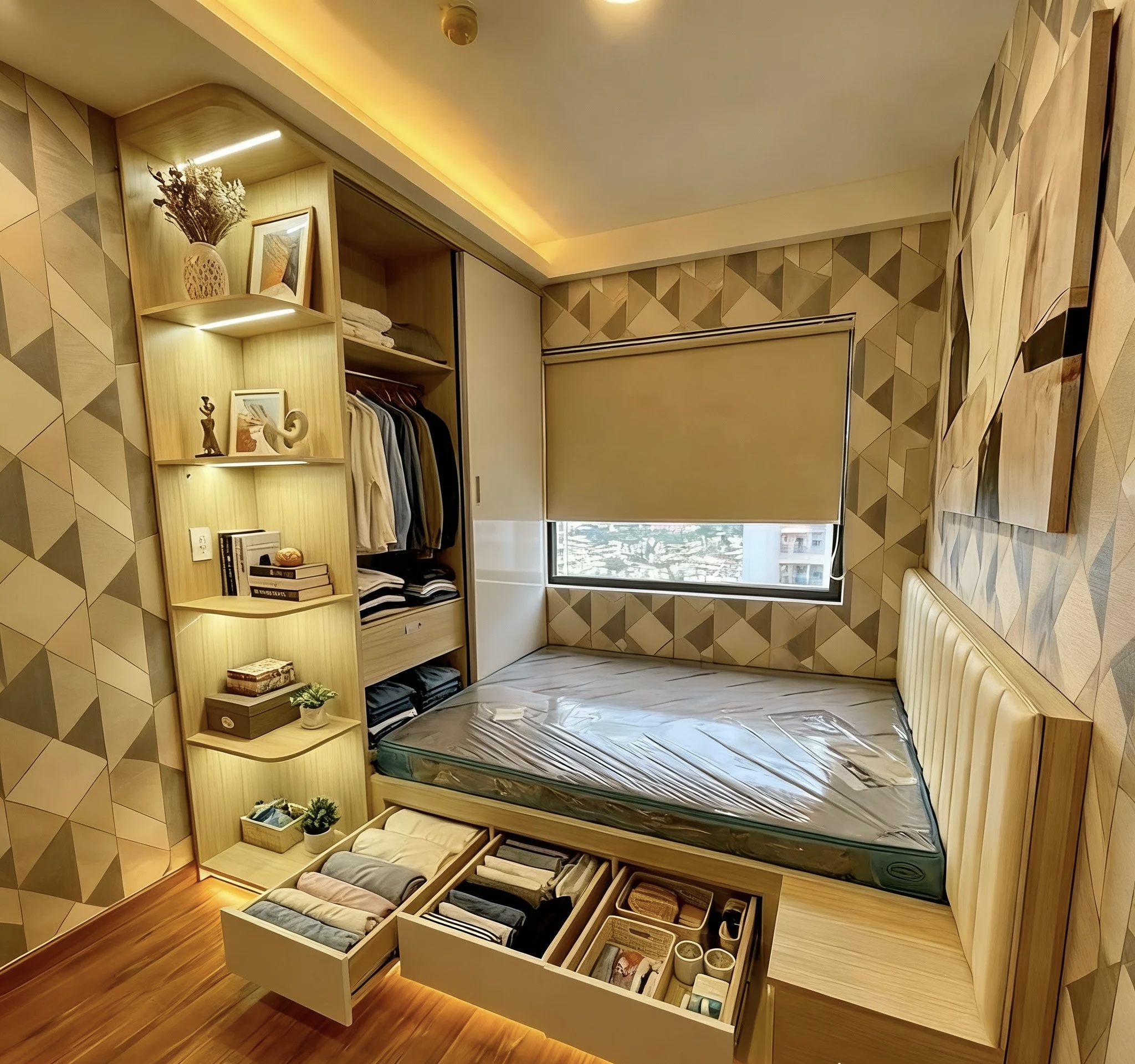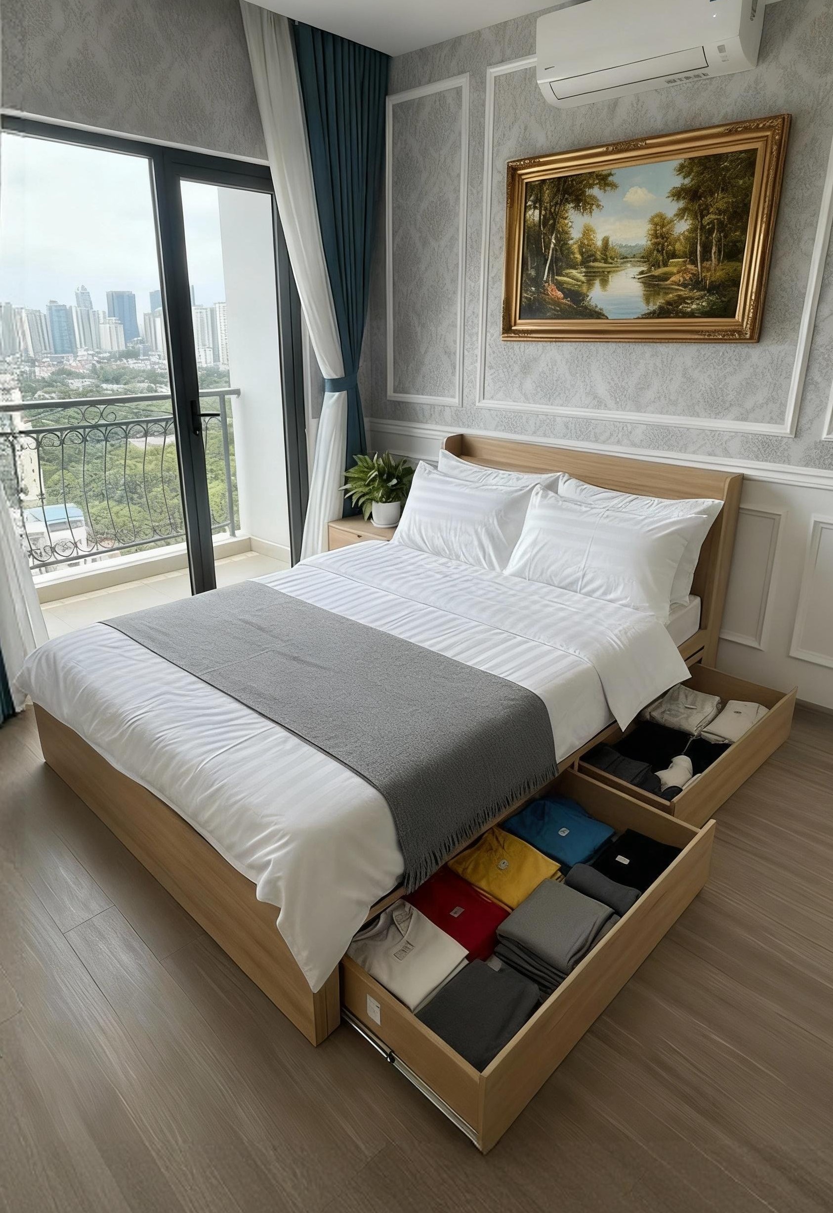 -Giường ngủ: Ưu tiên kích thước 1m6x2m hoặc 1mx2m. Điểm nhấn là hệ ngăn kéo tích hợp dưới gầm giường – nơi cất giấu chăn ga, gối đệm dự phòng gọn gàng mà không tốn thêm 1cm diện tích nào.