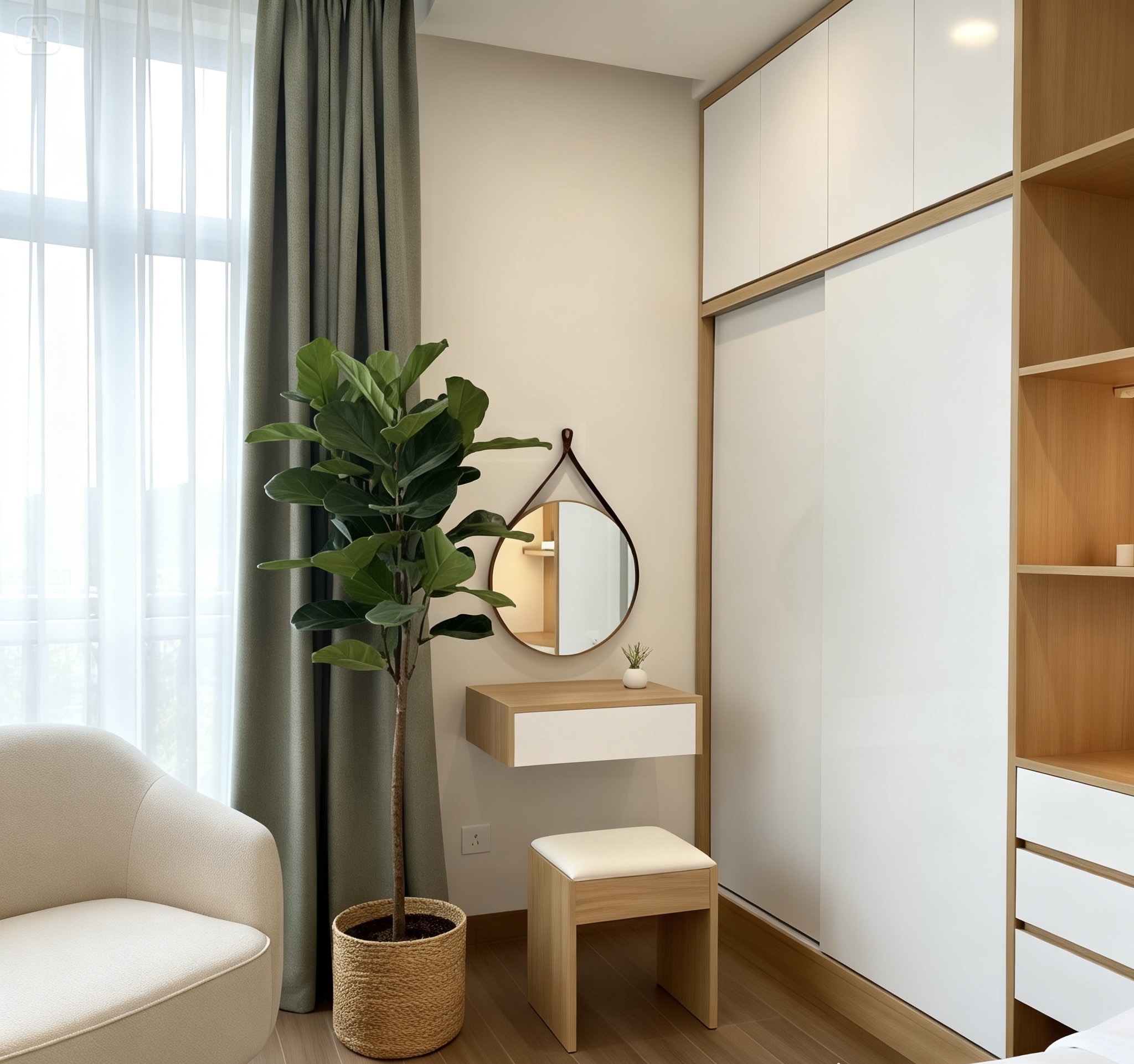 - 1 bàn trang điểm treo ngang 60cm + ghế đôn, gương tròn 50cm ( không gồm dây da )
