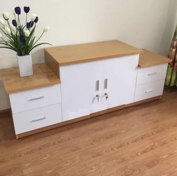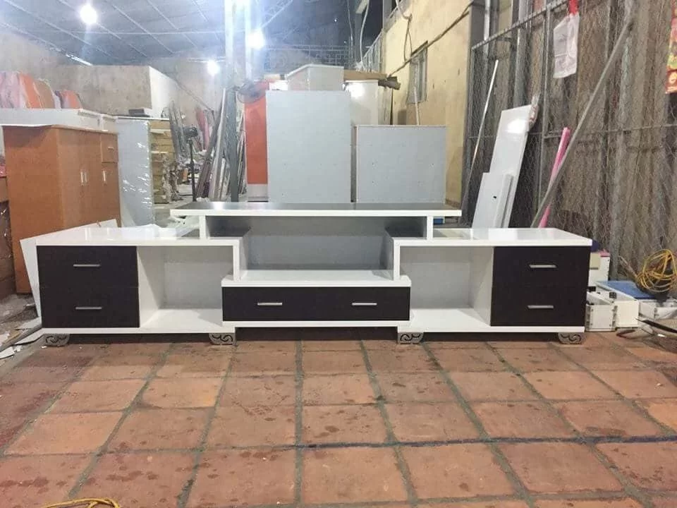 -Mẫu kệ tivi này thường thiết kế kéo dài kết hợp 2 tủ đứng cạnh bên nhau tạo sự sang trọng.