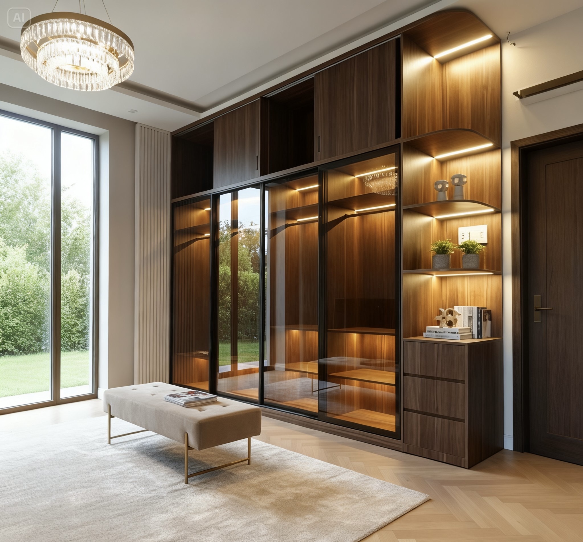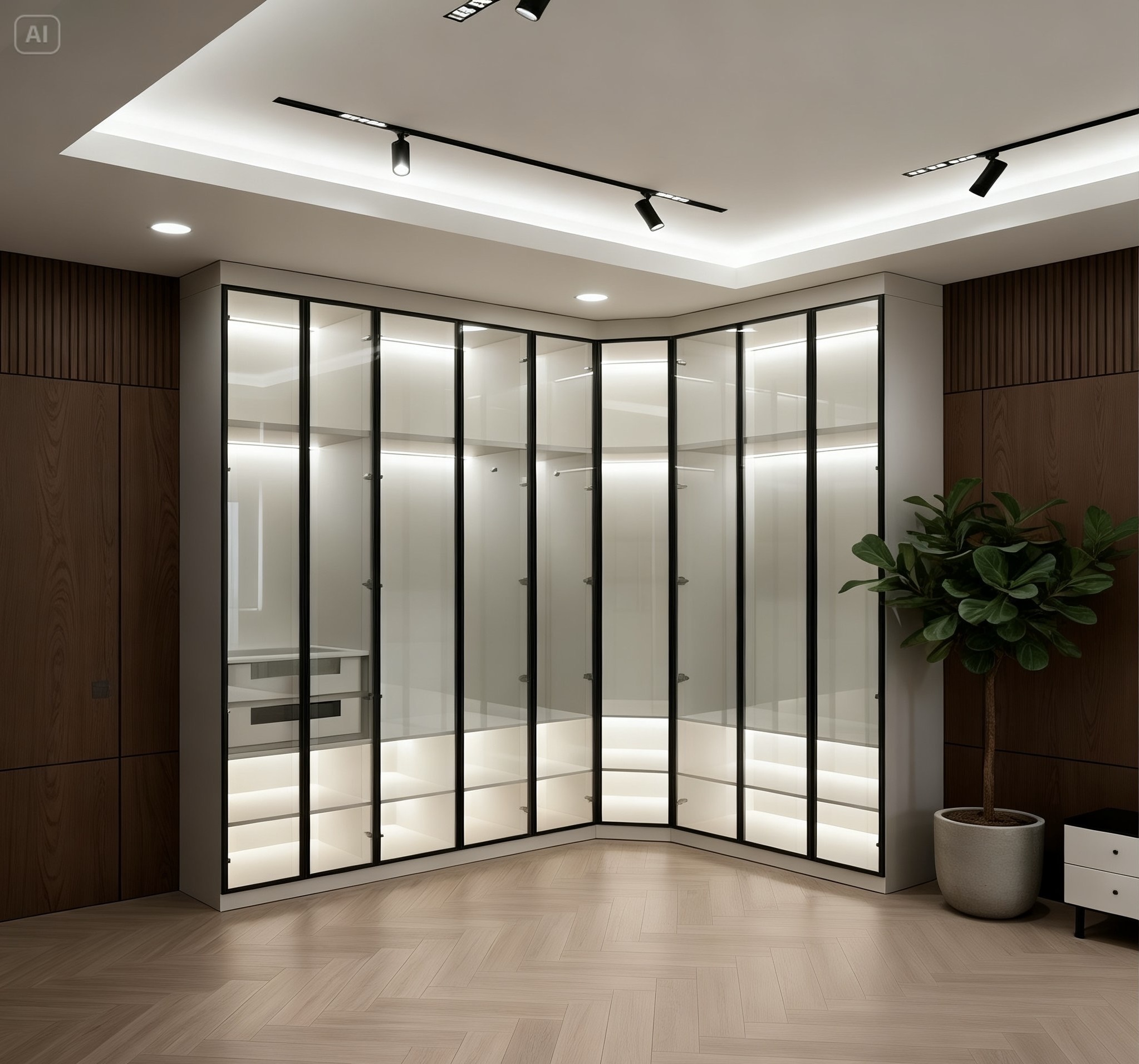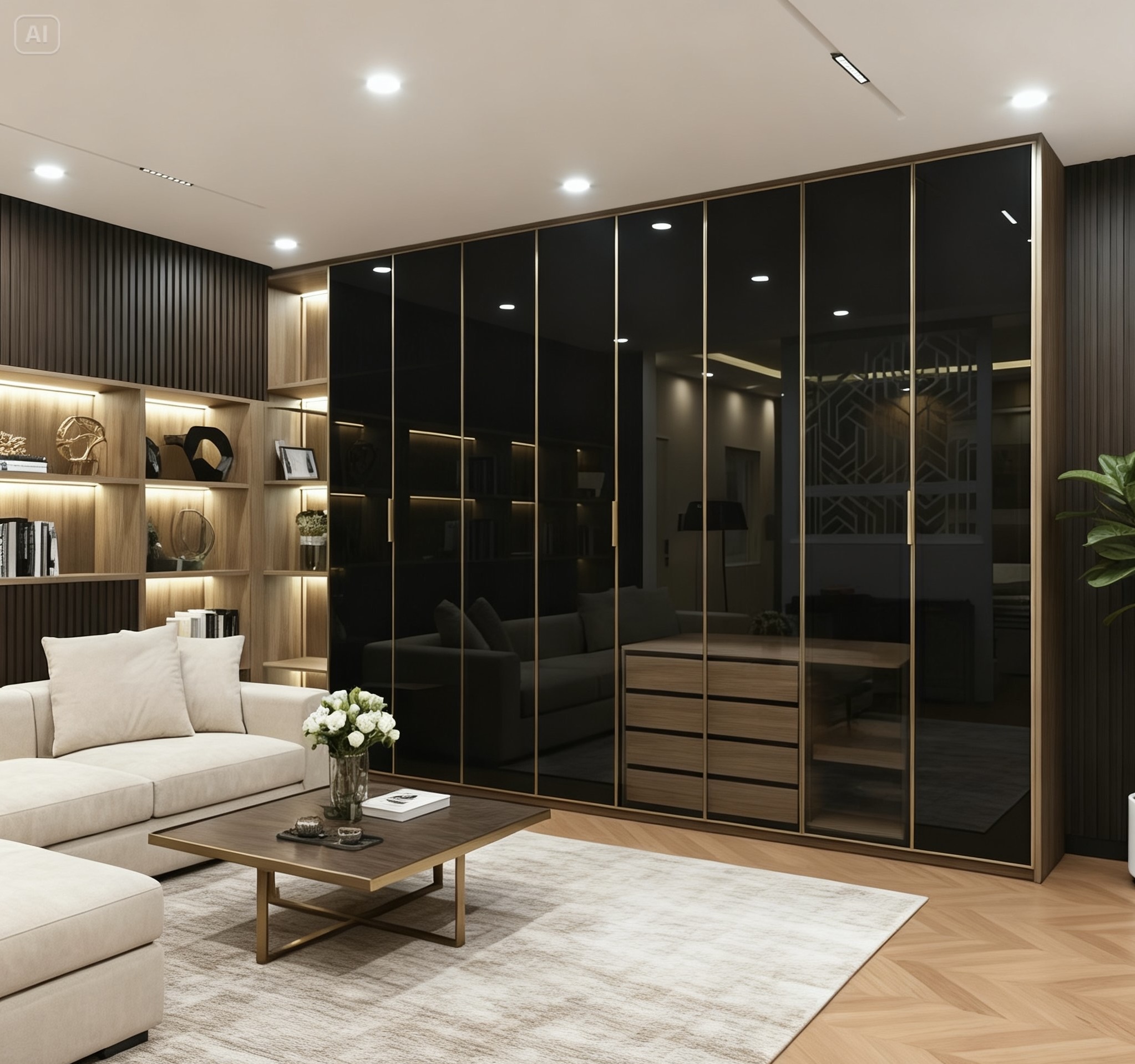 Không còn là những khối gỗ kín mít, nặng nề. Cánh kính cường lực (xám khói/trắng trong) kết hợp cùng khung nhôm Slim siêu mảnh tạo nên hiệu ứng thị giác mở rộng, giúp không gian trở nên thoáng đãng và tinh tế hơn.