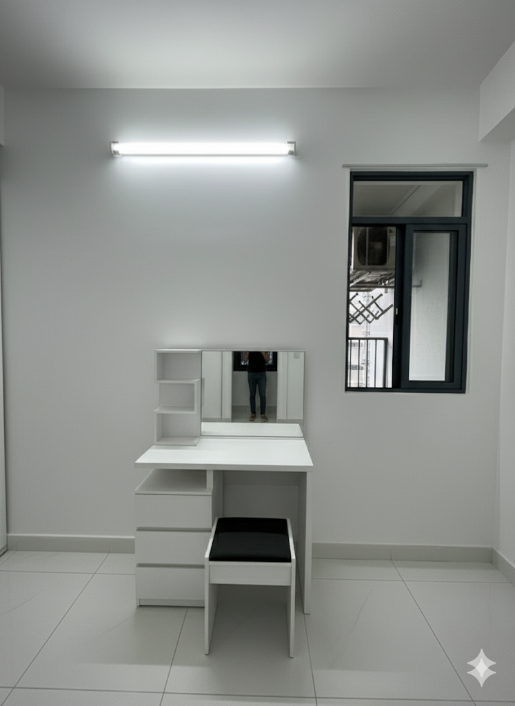 - 1 bàn trang điểm 80cm x 1m5 x 45cm + đôn ngồi