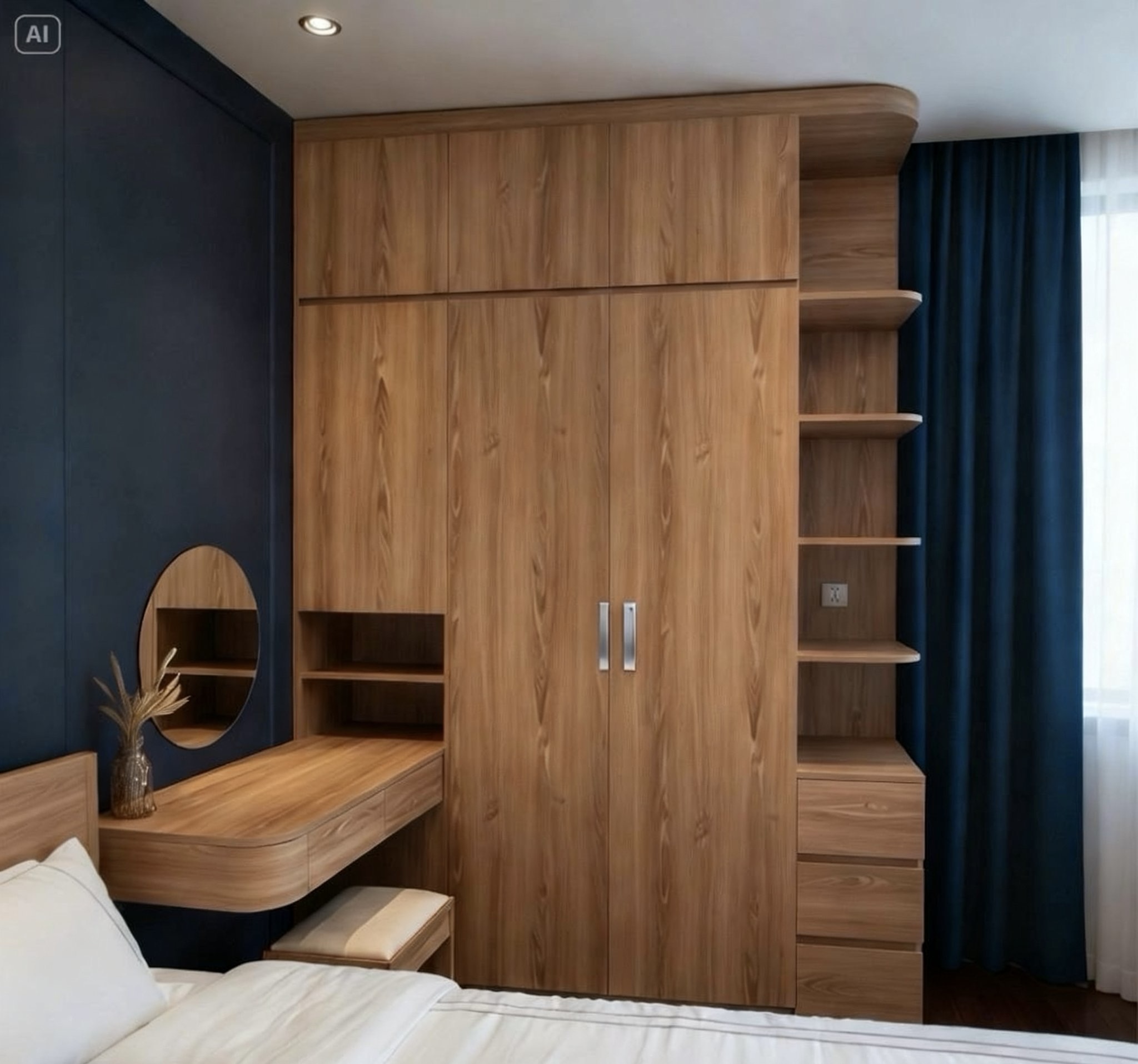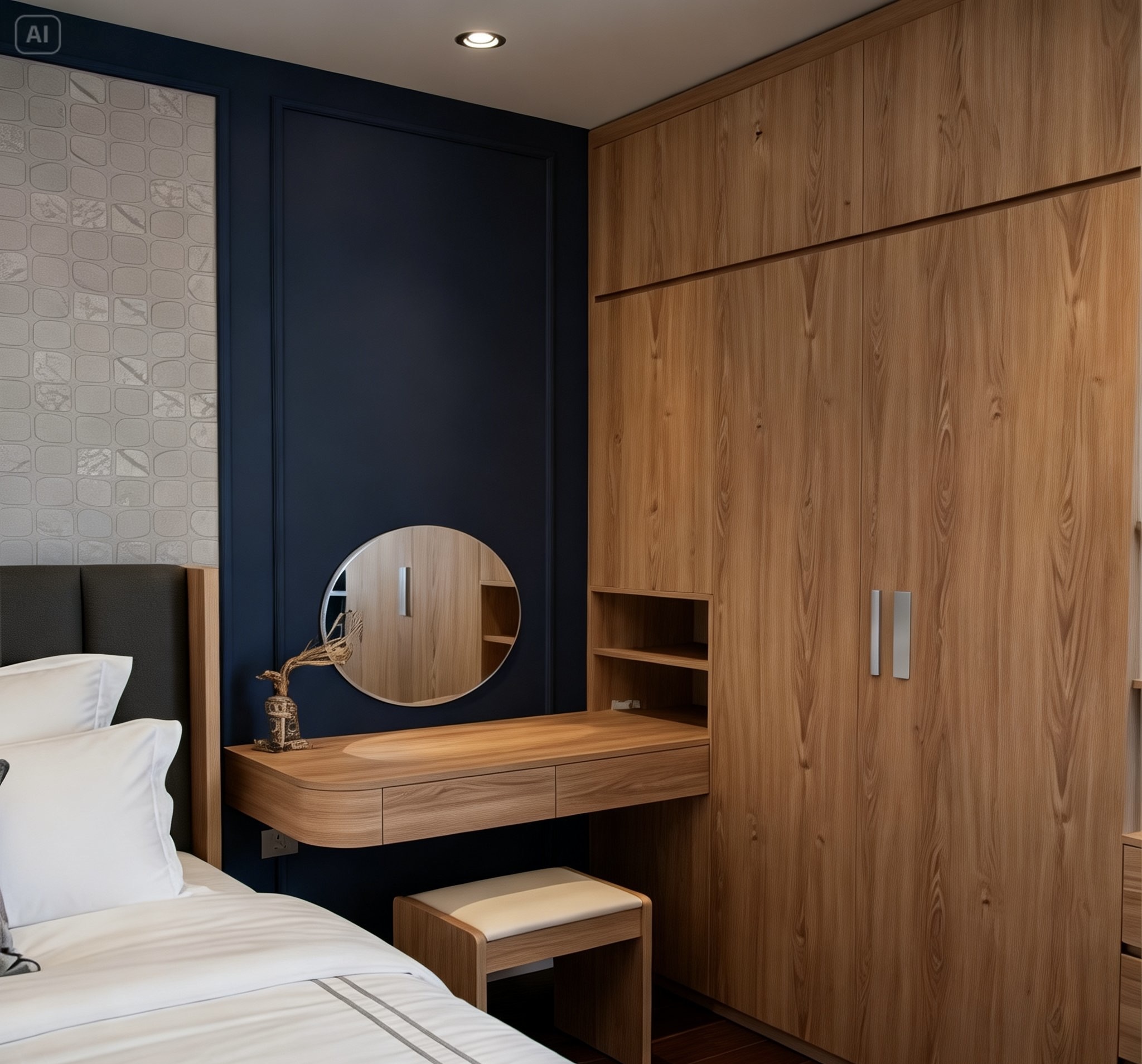 - 1 bàn trang điểm treo 60cm + gương tròn + đôn ngồi