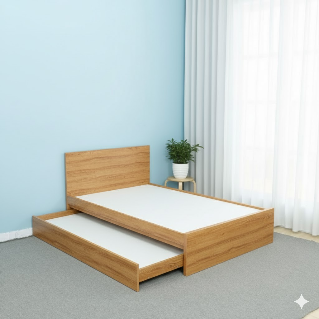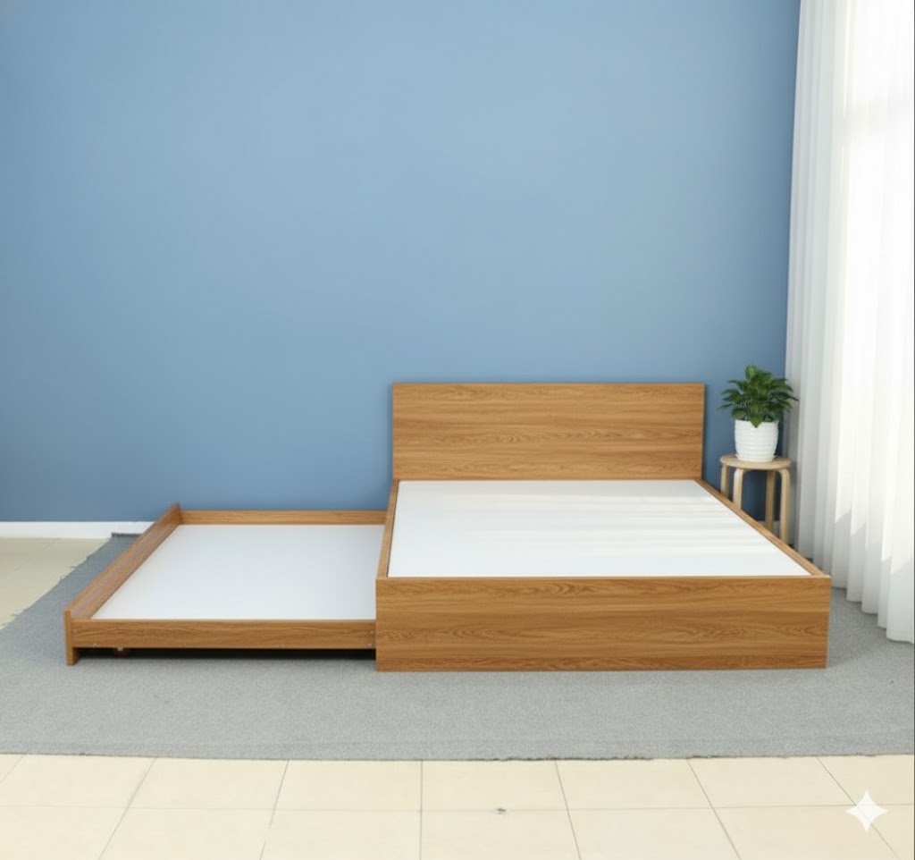 Giường kéo gỗ MDF (Medium-Density Fibreboard) là loại giường được làm từ gỗ công nghiệp, kết hợp với một phần giường phụ có thể kéo ra vào linh hoạt. Thiết kế này giúp tối ưu hóa không gian, đặc biệt phù hợp với các căn hộ nhỏ, phòng trọ hoặc phòng ngủ của trẻ em. Khi không sử dụng, giường phụ được giấu gọn gàng bên dưới giường chính, tạo không gian sinh hoạt rộng rãi hơn.
