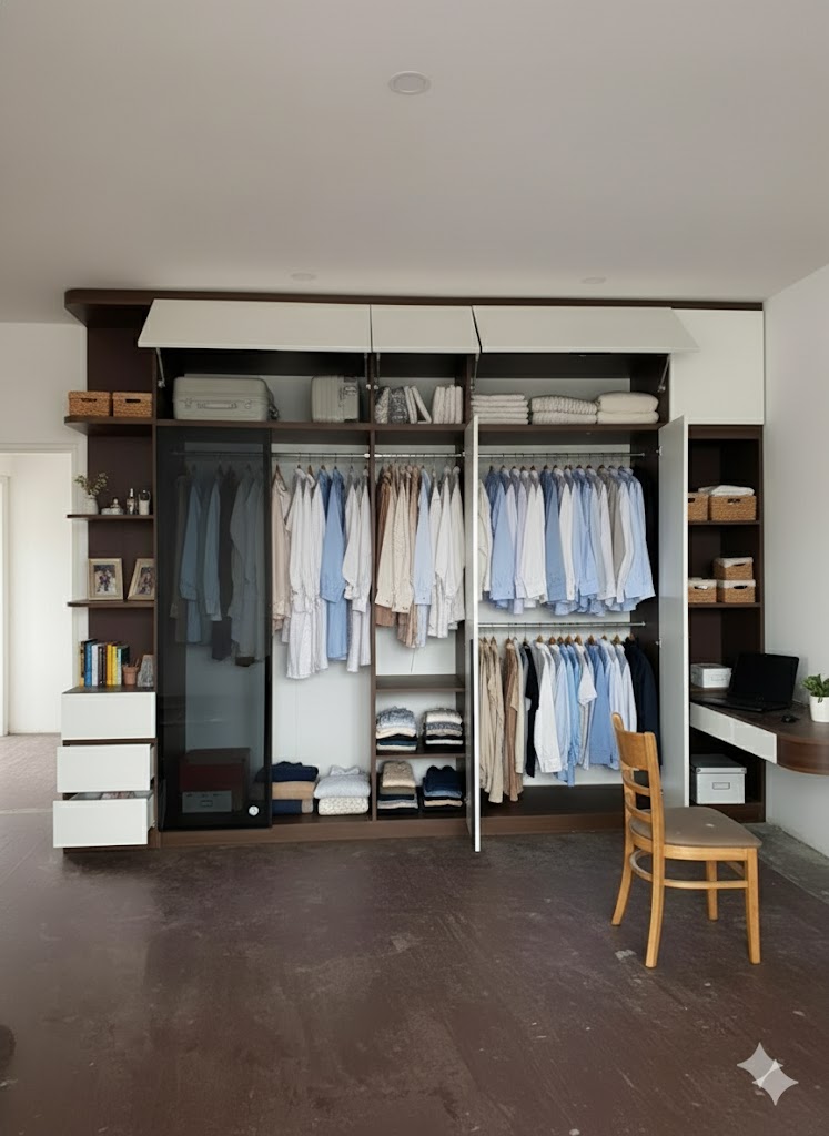 Thiết kế thông minh: Tủ được tích hợp nhiều loại ngăn, từ cánh cửa tủ quần áo, ngăn kéo, cho đến các kệ trang trí và bàn làm việc/trang điểm.