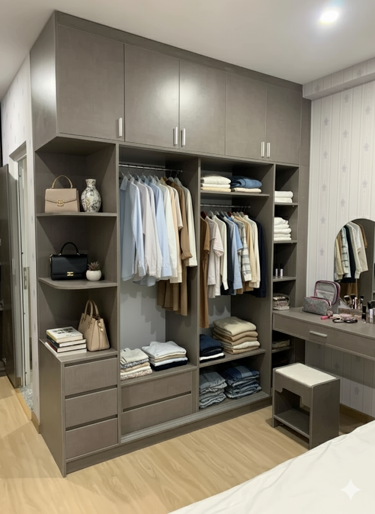 Ngăn kéo và kệ: Bên trái là một khối tủ nhỏ hơn gồm các ngăn kéo, tiện lợi để đựng đồ lót hoặc phụ kiện. Bên trên là các kệ hở, có thể dùng để trưng bày túi xách hoặc các vật trang trí.