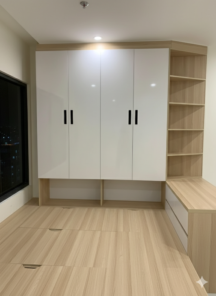 Thiết kế thông minh: Bàn làm việc không có chân ở một bên, mà được gắn trực tiếp vào vách tủ, giúp không gian dưới chân bàn rộng rãi và gọn gàng hơn.